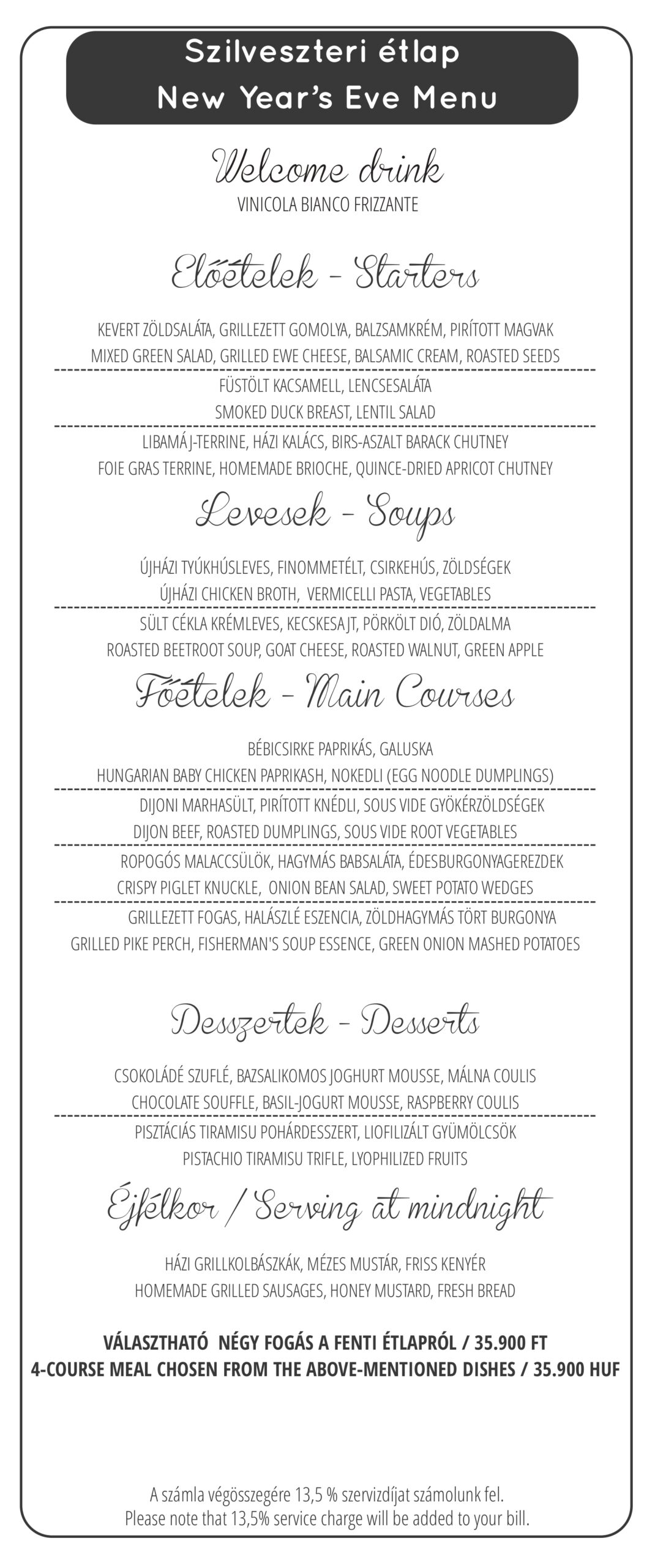 Az est díja 35.900 Ft + 13,5 % szervizdíj/fő, amely tartalmazza a szilveszteri étlapról szabadon kiválasztott 4 fogásos menüt, a welcome drinket és az éjféli kóstolót.