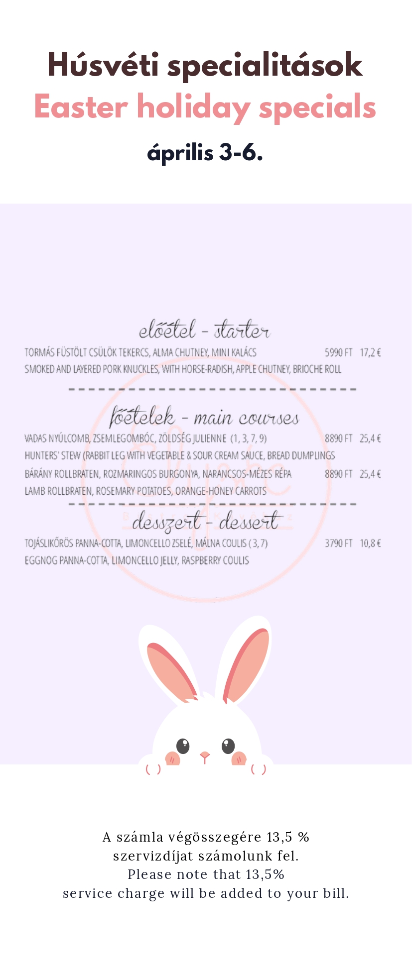 Április 3-6. között különleges húsvéti menüsorral várunk: kóstoljátok meg a vadas nyúlcombot, a hagyományos házi füstölt csülköt vagy a tojáslikőrös panna-cotta desszertet. Élvezzétek a napsütést a teraszunkon egy pohár finom borral, a Parlament lenyűgöző látványával. Töltsétek nálunk az ünnepeket gourmet fogások társaságában! Várunk szeretettel!