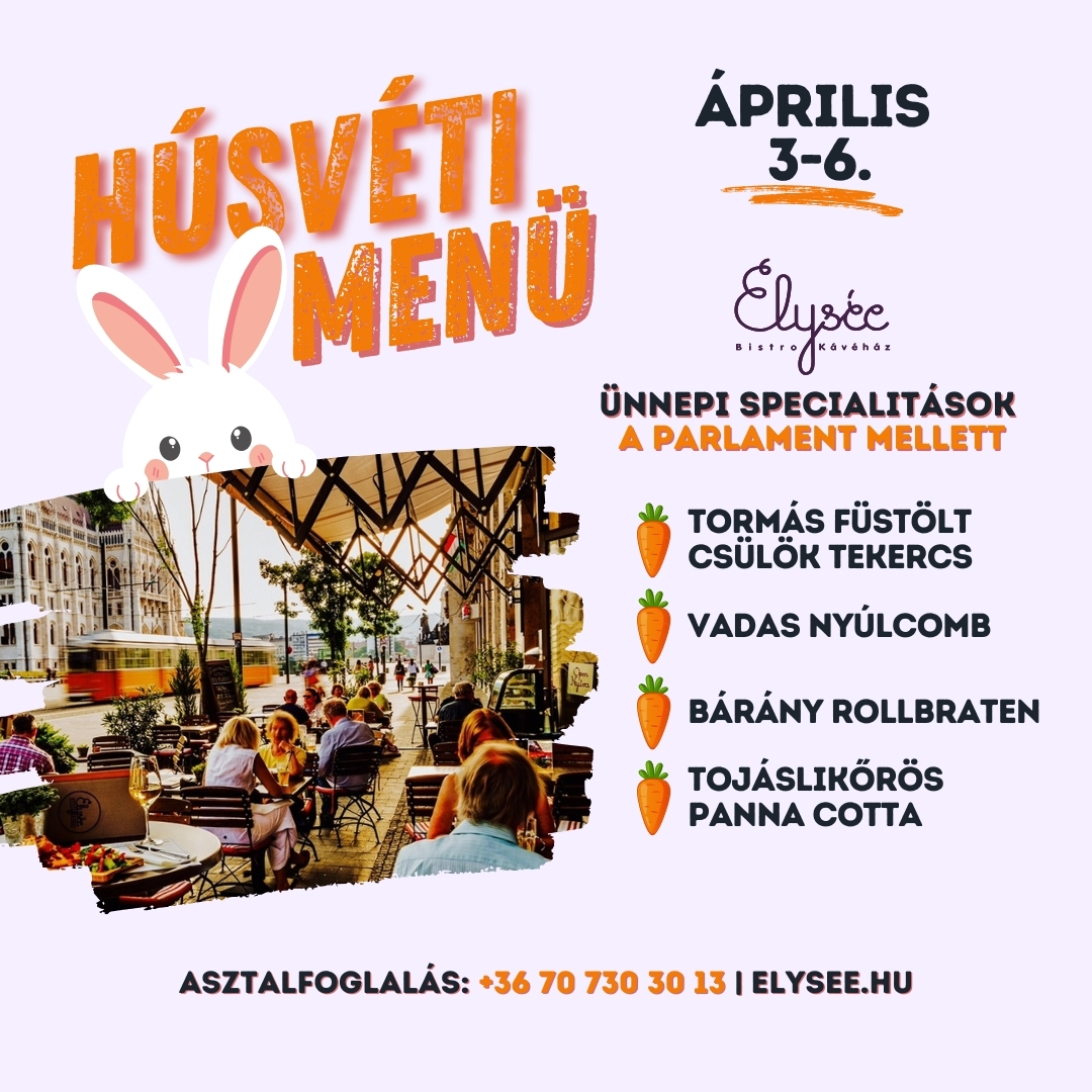 Április 3-6. között különleges húsvéti menüsorral várunk: kóstoljátok meg a vadas nyúlcombot, a hagyományos házi füstölt csülköt vagy a tojáslikőrös panna-cotta desszertet. Élvezzétek a napsütést a teraszunkon egy pohár finom borral, a Parlament lenyűgöző látványával. Töltsétek nálunk az ünnepeket gourmet fogások társaságában! Várunk szeretettel!