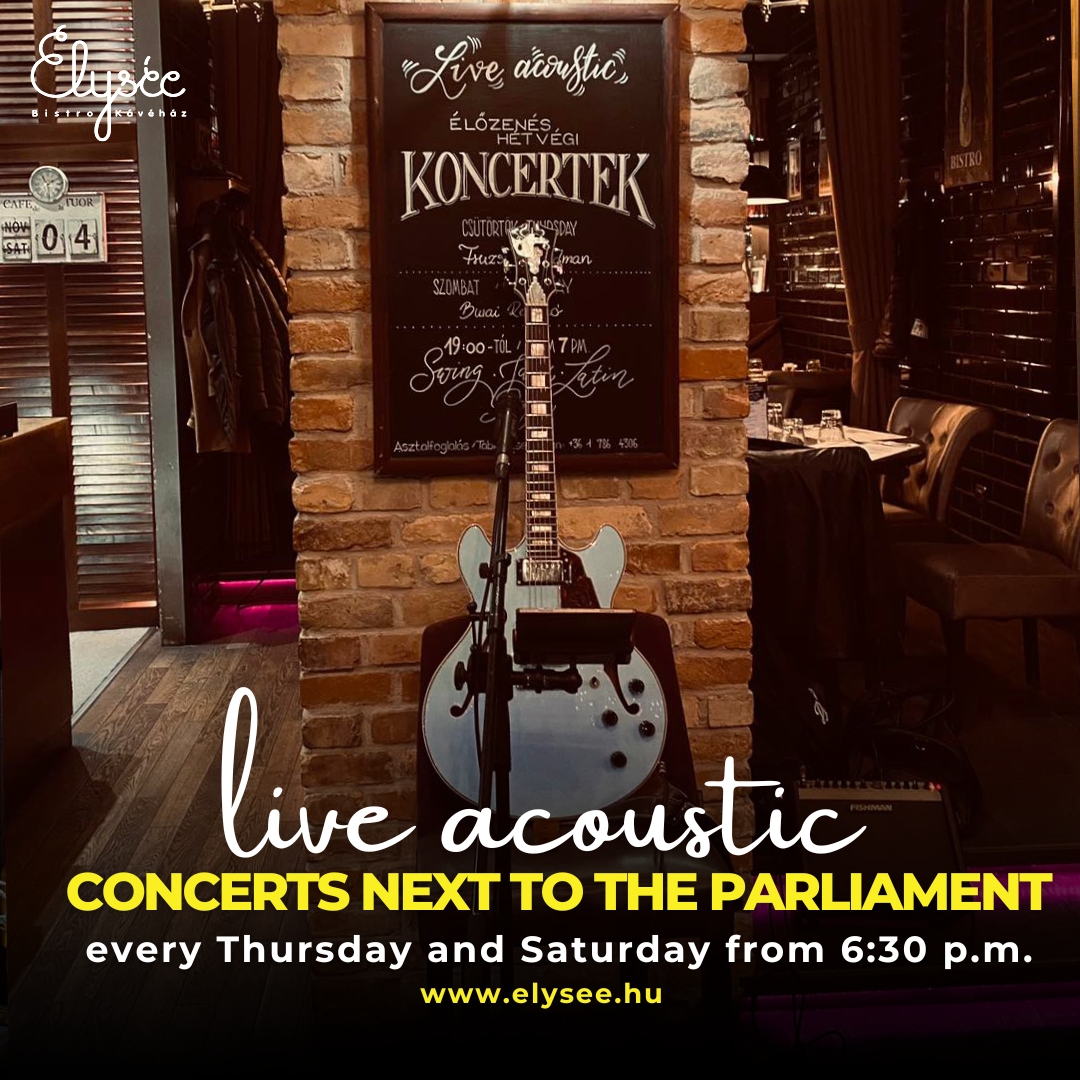Every Thursday and Saturday evening from 18:30, live acoustic concerts at the Elysée! Contemporary and evergreen hits, in pop & rock, jazz, soul, and funky styles, performed by a variety of artists. In addition to the pleasant melodies, you can enjoy the breathtaking view of the Parliament and Kossuth Square while enjoying a gourmet dinner or a glass of fine wine.